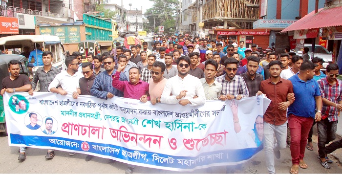 নবগঠিত কেন্দ্রীয় ছাত্রলীগের পূর্ণাঙ্গ কমিটিকে স্বাগত জানিয়ে নগরীতে আনন্দ মিছিল করেছে সিলেট মহানগর ছাত্রলীগ।