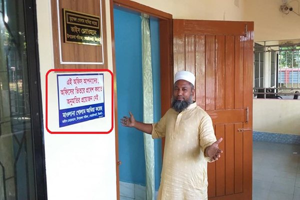 অফিসের দরজায় উপরে নামফলক। নিচে লাল অক্ষরে আরেকটি কাগজে লিখা ‘এই অফিস আপনাদের,অফিসের ভিতর প্রবেশ করতে অনুমতির প্রয়োজন নেই’।