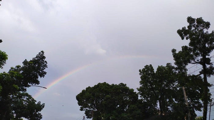 সিলেটের আকাশে রঙধনু। বৃহস্পিতবার বিকেলে সিলেটের বন্দরবাজার এলাকা থেকে ছবিটি তোলা