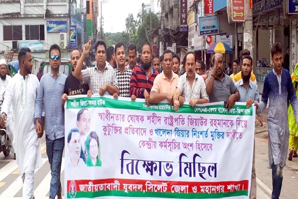 সাবেক রাষ্ট্রপতি জিয়াউর রহমানকে নিয়ে কটূক্তির প্রতিবাদে ও বিএনপি চেয়ারপার্সন বেগম খালেদা জিয়ার নিঃশর্ত মুক্তির দাবিতে কেন্দ্রীয় কর্মসূচীর অংশ হিসেবে বিক্ষোভ মিছিল করেছে সিলেট জেলা ও মহানগর যুবদল।