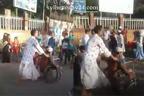 হুইল চেয়ারে বসে আসেন মাথায় টুপি পরিহিত এক বয়স্ক ব্যক্তি। হুইল চেয়ার সমেত তাকে ঠেলে নিয়ে যাচ্ছেন ধুতি পরিহিত এক তরুণ। তাদের পোষাকই জানান দিচ্ছে- হুইল চেয়ারে বসা লোকটি ধর্মে মুসলমান। আর হুইল চেয়ার ঠেলে নেওয়া তরুণটি হিন্দু।