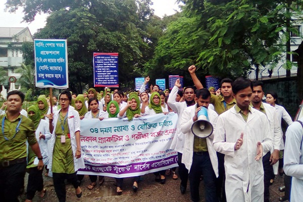 তাদের দাবিগুলো হলো- চার বছর মেয়াদি বিএসসি ইন নার্সিং কোর্সকে স্বতন্ত্র হিসেবে রাখা, নার্সিং পেশায় স্বতন্ত্র পেশাগত ক্যাডার সার্ভিস বিসিএস (সেবা) চালু করা, ইন্টার্ন ভাতা ৬ হাজার থেকে ২০ হাজার টাকা করা এবং বৃত্তি ২ হাজার থেকে ৫ হাজার টাকায় উন্নীত করা এবং সব নার্সিং কলেজের জন্য ক্লিনিক্যাল প্র্যাকটিস নার্স (সিপিএন) পদ সৃষ্টি করে নার্সিং কলেজকে পূর্ণাঙ্গ কলেজে রূপান্তরিত করা।