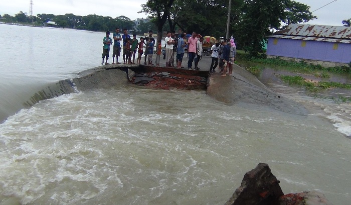 ভারী বর্ষণ ও পাহাড়ি ঢলে সুনামগঞ্জ শহরের সুরমা নদীর তীরের নবীনগর-হালুয়ারঘাট এলাকার সড়ক ভেঙ্গে গেছে। এতে সদর উপজেলার কোরবাননগর ইউনিয়নের একাংশ, সুরমা ইউনিয়নের একাংশ, জাহাঙ্গীর নগর ইউনিয়ন এবং দোয়ারাবাজার উপজেলার লক্ষীপুর ইউনিয়নের একাংশের সড়ক যোগাযোগ বিচ্ছিন্ন হয়ে পড়েছে। ওই সড়কে যাতায়াতকারী ২ লাখ মানুষ দুর্ভোগে পড়েছেন।