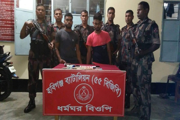ধর্মঘর সীমান্ত ফাঁড়ির সীমান্ত ফাঁড়ির হাবিলদার জাকিরুল ইসলামের নেতৃত্বে বিজিবি সদস্যরা অভিযান চালিয়ে ২শ পিস ইয়াবাসহ ব্রাহ্মণবাড়িয়া জেলার বিজয়নগর উপজেলার বুধন্তী গ্রামের রশ রাজ চৌধুরীর ছেলে দয়াল চৌধুরী (২৪) এবং একই গ্রামের রিসু রাজ চৌধুরীর ছেলে অপূর্ব চৌধুরী (২১) কে আটক করে।