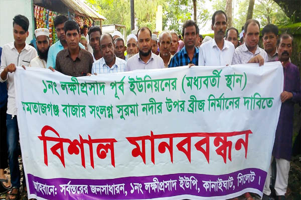 সিলেটের কানাইঘাট উপজেলার লক্ষীপ্রসাদ পূর্ব ইউপির মধ্যবর্তী মমতাজগঞ্জ বাজার সংলগ্ন সুরমা নদীর উপর সেতু নির্মাণের দাবিতে মানববন্ধন করেছেন এলাকাবাসী ।
