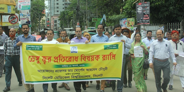 সিলেটের প্রথম সিলেট মেডিকেল বিশ্ববিদ্যালয়ের উদ্যোগে ডেঙ্গু রোধ প্রতিরোধ বিষয়ক সচেতনতা সৃষ্টির জন্য ‘পরিবেশ পরিস্কার-পরিচ্ছন্ন রাখি ডেঙ্গু থেকে মুক্ত থাকি’ ও ‘স্বাস্থ্য সেবা অধিকার শেখ হাসিনার অঙ্গিকার’ এই স্লোগান নিয়ে চৌহাট্টাস্থ বিশ্ববিদ্যালয় অফিস প্রাঙ্গন থেকে র্যালি বের হয়ে নগরীর প্রধান প্রধান সড়ক প্রদক্ষিণ করে। এসময় রাস্তার দু’ধারে মানুষ যানবাহন ও বিভিন্ন ব্যবসা প্রতিষ্ঠানে বিশ্ববিদ্যালয় প্রকাশিত ডেঙ্গু জ্বরের লক্ষণ ডেঙ্গু জ্বরে করণীয় শীর্ষক সচেতনতামূলক লিফলেট বিতরন করা হয়। পরে বিশ্ববিদ্যালয় অফিস ও পাশ্ববর্তী বিভিন্ন এলাকায় মশার ঔষধ স্প্রে করা হয়।