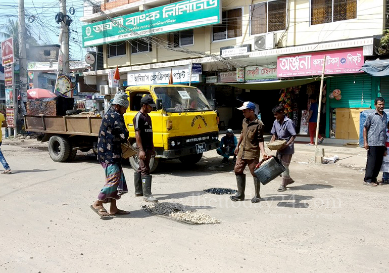 বুধবার (২১ আগস্ট) সরেজমিনে স্টেশন রোডে গিয়ে দেখা যায়, সড়ক ও জনপথ বিভাগের একটি ট্রাকে বিটুমিন আগুনের তাপে গলিয়ে রাস্তার গর্তে পাথর দিয়ে বিটুমিন দেয়া হচ্ছে। তবে রোলিং ও পর্যাপ্ত পরিষ্কার না করায় সড়কটি হয়ে উঠছে আরও অসমতল। চলাচলরত যানবাহনের চাকায় লেগে উঠে যাচ্ছে বিটুমিন ও পাথর। কোথাও উঁচু কোথাও নিচু হয়ে থাকায় এখানে বৃষ্টির পানি জমাটা খুবই স্বাভাবিক বিষয় আর এতেই বিটুমিন উঠে সড়ক খানাখন্দে ভরে উঠাও যেন নিয়তি। এক কিলোমিটার এই রাস্তা। এই রাস্তার পুরো অংশেই খানাখন্দে ভরা। দীর্ঘদিন থেকে পুনঃ সংস্কার বা নির্মাণকাজ না হওয়ায় ভোগান্তি নিয়েই এই পথে চলাচল করছেন স্থানীয় লোকজন ও পর্যটকরা।