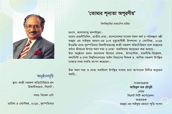 অনুষ্ঠানে সভাপতিত্ব করবেন ‘মরহুম এম সাইফুর রহমান স্মৃতি পরিষদ' এর আহবায়ক সিলেট সিটি করপোরেশনের মেয়র আরিফুল হক চৌধুরী।