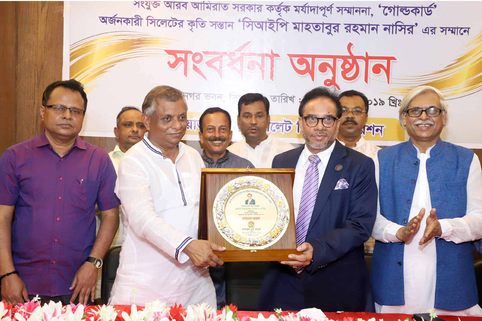 সংযুক্ত আরব আমিরাত সরকার ঘোষিত গোল্ডকার্ডপ্রাপ্ত এনআরবি ব্যাংকের চেয়ারম্যান ও আল হারামাইন পারফিউম গ্রুপ অব কোম্পানির চেয়ারম্যান ও ব্যবস্থাপনা পরিচালক সিআইপি মাহতাবুর রহমান নাসিরকে সংবর্ধনা দিয়েছে সিলেট সিটি করপোরেশন।
