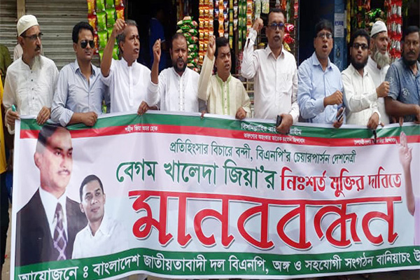 বিএনপি চেয়ারপারসন খালেদা জিয়ার নিঃশর্ত মুক্তির দাবিতে মানববন্ধন কর্মসূচি পালন করেছে বানিয়াচং উপজেলা বিএনপি।