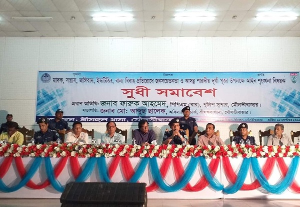 সুধী সমাবেশে সভাপতিত্ব করেন শ্রীমঙ্গল থানার ভারপ্রাপ্ত কর্মকর্তা (ওসি) মো. আব্দুস ছালেক পুলিশ পরিদর্শক (তদন্ত)সোহেল রানার সঞ্চালনায় বিশেষ অতিথি হিসেবে উপস্থিত ছিলেন উপজেলা চেয়ারম্যান রনধীর কুমার দেব, শ্রীমঙ্গল উপজেলা নির্বাহী কর্মকর্তা নজরুল ইসলাম, জেলার অতিরিক্ত পুলিশ সুপার(অপরাধ ও প্রসাশন)আনোয়ারুল হক,সিনিয়র সহকারী পুলিশ সুপার মো.আশরাফুজ্জামান, শ্রীমঙ্গল পৌর মেয়র মহসিন মিয়া,জেলা আওয়ামী লীগের সাংগঠনিক সম্পাদক সৈয়দ মনসুরুল হক, উপজেলা আওয়ামী লীগের ভারপ্রাপ্ত সভাপতি আছকির মিয়া, সাবেক বিভাগীয় স্বাস্থ্য কর্মকর্তা ডা. হরিপদ রায়, উপজেলা ভাইস চেয়ারম্যান প্রেমসাগর হাজরা, সদর ইউপি চেয়ারম্যান ভানুলাল রায়, কালিঘাট ইউপি চেয়ারম্যান প্রাণেশ গোয়ালা, মহিলা ভাইস চেয়ারম্যান মিতালী দত্ত, শ্রীমঙ্গল প্রেসক্লাব সভাপতি বিশ্বজ্যোতি চৌধুরী।