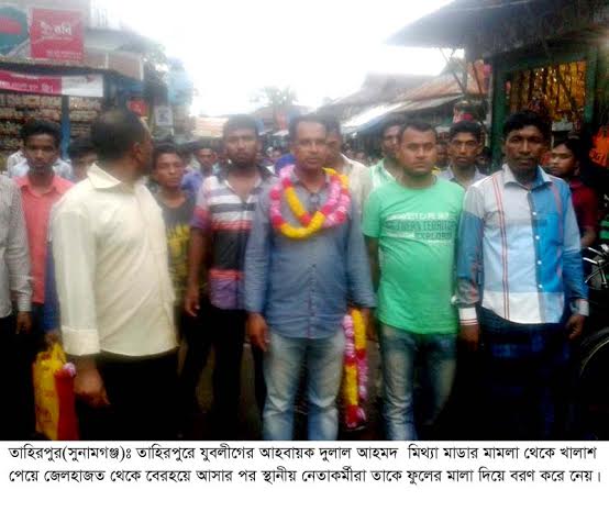 যুবলীগ নেতা দুলাল আহমদ দীর্ঘ ২২ দিন জেল হাজেত কাটার পর তাহিরপুর থানার মামলার তদন্ত কর্মর্কতা মামলার তদন্ত করে যুবলীগ নেতা দুলাল ও তার পরিবারের আরও ৩ সদস্যের বিরোদ্ধে মতিন মাডার মামলার আসামী করায় ওই মাডারের সাথে তাদের কোনরকম সংশ্লীষ্টতা না পাওয়া তাদের ৪ জনকে মামলার সার্জশিট থেকে নাম বাদ দিয়ে আদালতে প্রেরণ করলে দুলালসহ তার পরিবারের ৪ সদস্যকে মিথ্যা মামলা থেকে খালাশ প্রদান করলে আজ দুপুরে যুবলীগের আহবায়ক দুলাল আহমদ জেলহাজত থেকে মুক্তি পান।