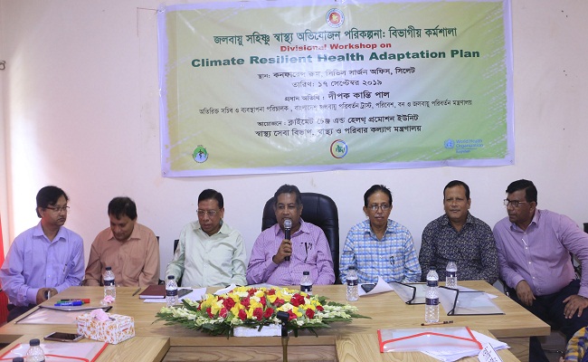সিলেট সিভিল সার্জন অফিসের কনফারেন্স রুমে সিলেট বিভাগীয় পরিচালক স্বাস্থ্য ডা. দেবপদ রায়ের সভাপতিত্বে জলবায়ু সহিষ্ণু স্বাস্থ্য অভিযোজন পরিকল্পনা বিষয়ক এ সিলেট বিভাগীয় কর্মশালা অনুষ্ঠিত হয়। উপ পরিচালক স্বাস্থ্য অধিদপ্তর ও সিলেটের সিভিল সার্জন ডা. হিমাংশু লাল রায়ের স্বাগত বক্তব্যের মাধ্যমে শুরু হওয়া অনুষ্ঠানে সম্মানিত অতিথির বক্তব্য রাখেন পরিবেশ বন ও জলবায়ু পরিবর্তন মন্ত্রণালয়ের পরিচালক ও সেক্রেটারি মো. মোক্তার আহমদ।