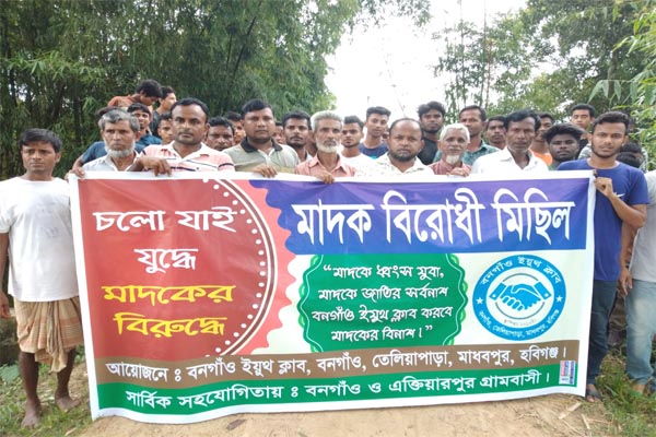 হবিগঞ্জের মাধবপুরের শাহজাহান পুর ইউনিয়নের বনগাঁও এবং এক্তারপুর গ্রামবাসী মাদক বিরোধী বিক্ষোভ মিছিল ও প্রতিবাদ সভা করেছেন। বিক্ষোভ মিছিলে ‘মাদক সেবনকারী ও বিক্রেতারা সাবধান’ ‘চল যাই যুদ্ধে, মাদকের বিরুদ্ধে’ এ ধরনের স্লোগান দেন গ্রামবাসী।
