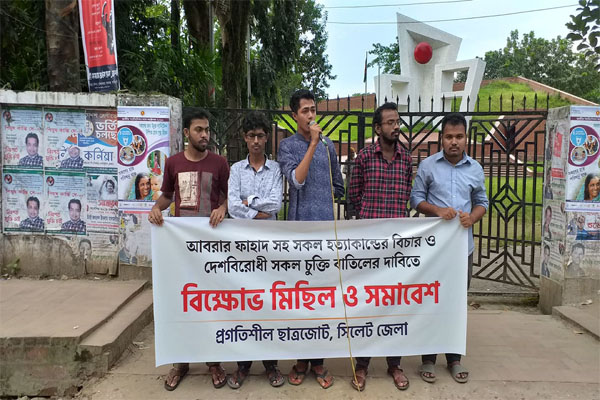 বাংলাদেশ প্রকৌশল বিশ্ববিদ্যালয়ের (বুয়েট) ছাত্র আবরার ফাহাদ হত্যাকাণ্ডের প্রতিবাদ ও দেশ বিরোধী সকল চুক্তি বাতিলের দাবিতে সিলেটে সমাবেশ ও বিক্ষোভ মিছিল করেছে প্রগতিশীল ছাত্র জোট।