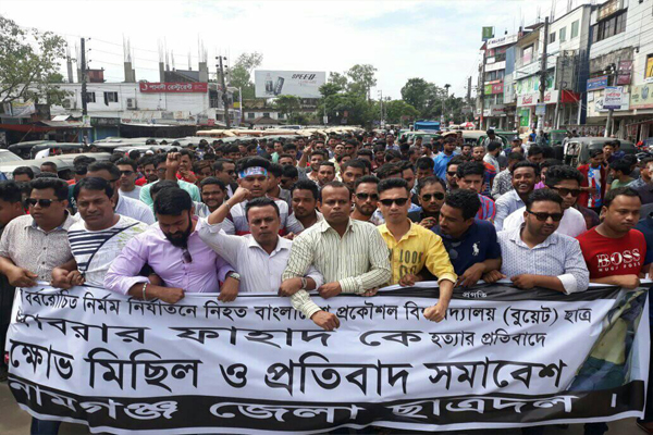 বাংলাদেশ প্রকৌশল বিশ্ববিদ্যালয়ের (বুয়েট) মেধাবী শিক্ষার্থী আবরার ফাহাদের হত্যার প্রতিবাদে সুনামগঞ্জ জেলা ছাত্রদলের উদ্যোগে বিক্ষোভ মিছিল ও পথসভা কর্মসূচি পালন করেছে।