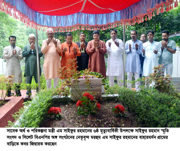 বিএনপির স্থায়ী কমিটির অন্যতম সদস্য, সাবেক অর্থ ও পরিকল্পনা মন্ত্রী এম সাইফুর রহমানের ৬ষ্ঠ মৃত্যুবার্ষিকী বিভিন্ন কর্মসূচীর মধ্য দিয়ে পালিত হয়েছে। শনিবার মৃত্যু বাষির্কী উপলক্ষে সকালে সাইফুর রহমান স্মৃতি সংসদ ও সিলেট বিএনপির অঙ্গসংগঠনের নেতৃবৃন্দ মরহুম এম সাইফুর রহমানের বাহারমর্দন গ্রামের বাড়িতে কবর জিয়ারত করেন।