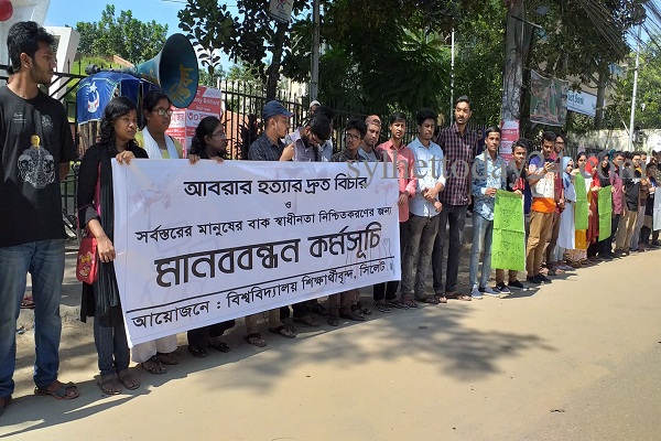 বুয়েট ছাত্র আবরার ফাহাদ হত্যাকাণ্ডের দ্রুত বিচার ও সর্বস্তরের মানুষের বাক স্বাধীনতা নিশ্চিতের দাবিতে সিলেটে মানববন্ধন করেছে বিশ্ববিদ্যালয়ের শিক্ষার্থীরা।