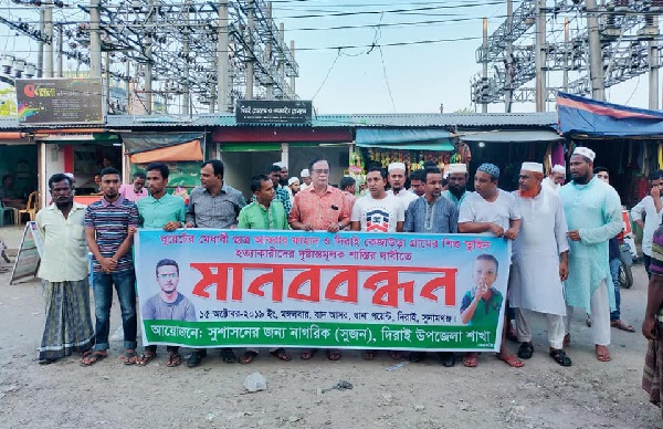 সুনামগঞ্জের দিরাই উপজেলার কেজাউড়া গ্রামে শিশু তুহিনকে নির্মমভাবে হত্যার প্রতিবাদে এবং হত্যাকারীদের দৃষ্টান্তমূলক শাস্তির দাবিতে মানববন্ধন করেছে সুশাসনের জন্য নাগরিক (সুজন) দিরাই উপজেলা কমিটি। মঙ্গলবার বিকেলে দিরাই প্রেসক্লাবের সামনে এ মানববন্ধন অনুষ্ঠিত হয়।