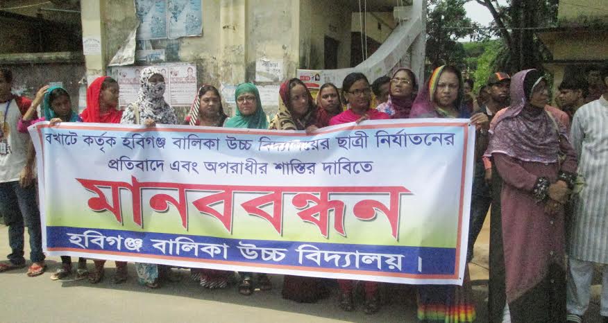 হবিগঞ্জে স্কুলছাত্রী নির্যাতনে ঘটনায় বিভিন্ন বিদ্যালয়, মহাবিদ্যালয়ের শিক্ষক-শিক্ষার্থীরা মানববন্ধন করেছেন।