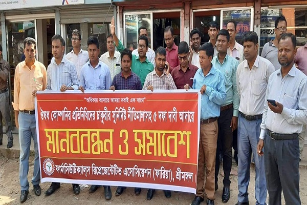 কেন্দ্রীয় কর্মসূচির অংশ হিসেবে বাংলাদেশ ফার্মাসিউটিক্যালস রিপ্রেজেন্টেটিভ এসোসিয়েশন (ফারিয়া) পাঁচ দফা দাবিতে মৌলভীবাজারের শ্রীমঙ্গলে মানববন্ধন করেছে।