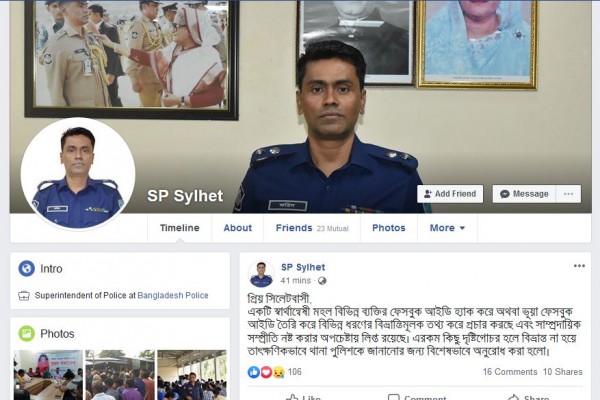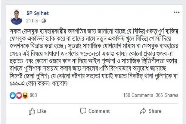 তিনি তার ঐ পোস্টে লিখেন, “সকল ফেসবুক ব্যবহারকারীর অবগতির জন্য জানানো যাচ্ছে যে বিভিন্ন গুরুত্বপূর্ণ ব্যক্তির ফেসবুক একাউন্ট হ্যাক করে বা তাদের নামে নতুন একাউন্ট খুলে বিভিন্ন পোস্ট দিয়ে জনগণকে বিভ্রান্ত করা হচ্ছে । সুতরাং সামাজিক যোগাযোগ মাধ্যম বা ফেসবুক ব্যবহারের ক্ষেত্রে এই বিষয়ে সাধারণ জনগণের সচেতনতা একান্ত কাম্য। কোনো প্রকার গুজব না ছড়াতে এবং কোনো গুজবে কান না দিয়ে আইন-শৃঙ্খলা ও সামাজিক স্থিতিশীলতা বজায় রাখতে পুলিশকে সহায়তা করার জন্য সকলের প্রতি বিশেষভাবে অনুরোধ জানাচ্ছে সিলেট জেলা পুলিশ। যে কোনো ঘটনার সত্যতা যাচাই করতে নিকটস্থ থানা পুলিশকে বা ৯৯৯-এ ফোন করুন। ধন্যবাদ।”