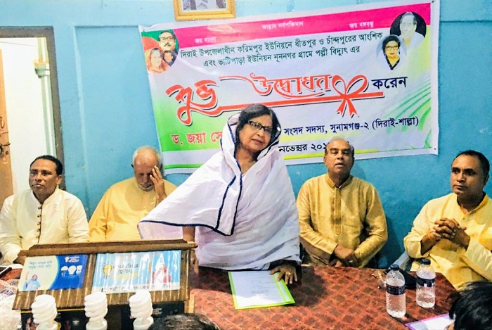 সুনামগঞ্জ-২ দিরাই শাল্লার সংসদ সদস্য ড জয়া সেনগুপ্তা বলেছেন, জননেত্রী শেখ হাসিনার নেতৃত্বে বাংলাদেশ আজ উন্নয়নের রোল মডেল, হাওর পাড়ের উন্নয়নে জননেত্রী শেখ হাসিনা খুবই আন্তরিক। দিরাই উপজেলা ৯ টি ইউনিয়ন ও পৌরসভার সবকটি এলাকায় বিদ্যুৎ পৌঁছে দেওয়া হয়েছে। প্রধানমন্ত্রী জননেত্রী শেখ হাসিনা ঘোষণা দিয়েছেন ২০১৯ সালের মধ্যে দেশের সকল পেশার মানুষ শতভাগ বিদ্যুৎ সুবিধা পাবে, ইতিমধ্যে সরকার ঘোষিত শতভাগ বিদ্যুতায়ন কর্মসূচির আওতায় দিরাই উপজেলায় আজ শতভাগ বিদ্যুতায়নের করা হলো।