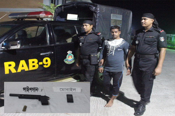 সংবাদ বিজ্ঞপ্তিতে র্যাব জানায়, এসএমপির থানাধীন বারখাল ২৫ নং ওয়ার্ড, চান্দাই রোড রুপালী আবাসিক এলাকার, ব্লক-ডি, বাসা নং-১৬ এর সামনের পাকা রাস্তার উপর থেকে ১৭টি মামলার আসামি রাজনকে ১টি পাইপগান ও ১টি কার্তুজসহ গ্রেপ্তার করে র্যাব-৯।