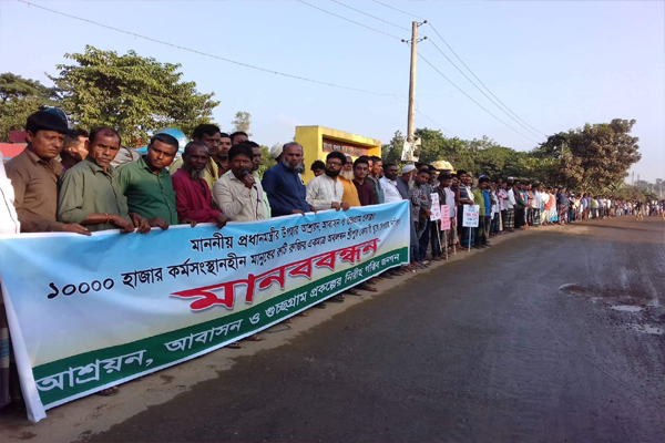 রোববার (২৪ নভেম্বর) বিকেলে শ্রমিক ও তাদের পরিবারের লোকজন বেলচা টুকরি নিয়ে মানববন্ধনে অংশ নেন।