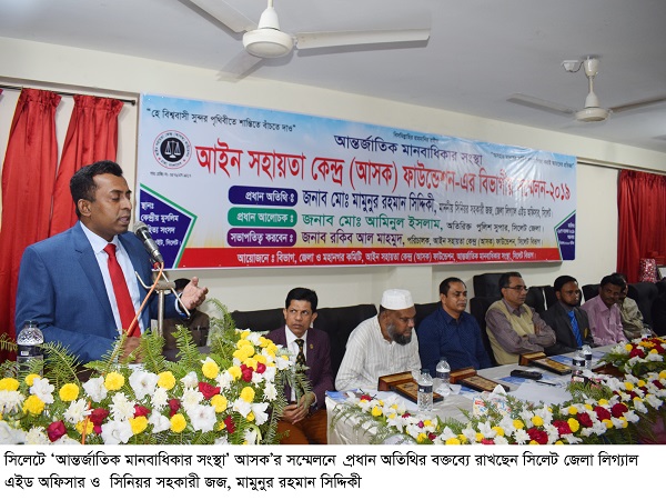 শুক্রবার শুক্রবার কেন্দ্রীয় মুসলিম সাহিত্য সংসদে আসক ফাউন্ডেশনের সিলেট বিভাগ’র পরিচালক মো. রকিব আল মাহমুদের সভাপতিত্বে ও সিলেটের বিভাগীয় সাংগঠনিক সুমন ইসলাম পরিচালনায় প্রধান অতিথির বক্তব্যে সিলেটের সিনিয়র সহকারী জজ মামুনুর রহমান সিদ্দিকী বলেন, বর্তমান সরকার মানবাধিকার রক্ষায় বদ্ধপরিকর। সর্বস্তরের মানবাধিকার প্রতিষ্ঠার লক্ষ্যে ইতোমধ্যে জাতীয় মানবাধিকার কমিশন আইন-২০০৯ প্রণয়ন এবং জাতীয় মানবাধিকার কমিশন গঠন করা হয়েছে। সরকার দারিদ্র্য বিমোচন, জনগণের জীবনমান উন্নয়নসহ মানবাধিকার রক্ষায় দেশ ও দেশের বাইরে নিরলস প্রয়াস চালিয়ে যাচ্ছে। বাংলাদেশ স¤প্রতি মিয়ানমার থেকে জোরপূর্বক বাস্তুচ্যুত বিপুল রোহিঙ্গা জনগোষ্ঠীকে মানবিক কারণে আশ্রয় দিয়ে মানবাধিকার রক্ষায় এক অনন্য দৃষ্টান্ত স্থাপন করেছে।