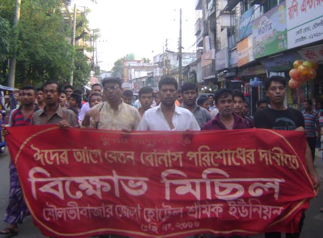 আসন্ন ঈদুল আজহা ও দূর্গা পূজায় প্রত্যেক হোটেল শ্রমিকদের মাসিক বেতনের সমপরিমান উৎসব বোনাস প্রদান, হোটেল সেক্টরে সরকার ঘোষিত নিম্নতম মজুরি ও শ্রম আইন কার্যকরের দাবিতে মৌলভীবাজার জেলা হোটেল শ্রমিক ইউনিয়ন বিক্ষোভ মিছিল ও সমাবেশ করেছে।
