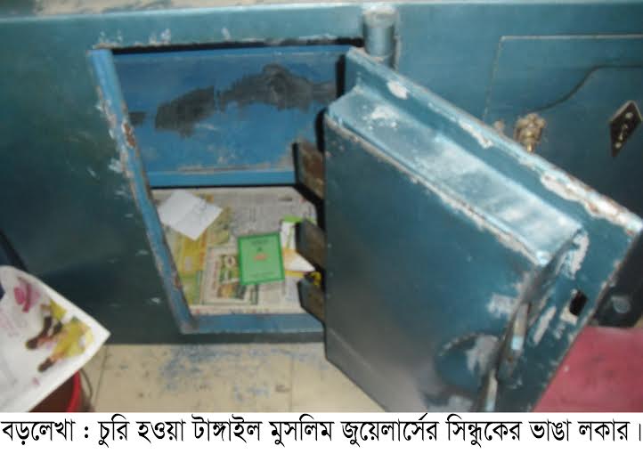 চুরি হওয়া দোকান মালিক ও থানা পুলিশ সুত্রে জানা গেছে, সোমবার দিবাগত রাতের যে কোন সময় পৌর শহরের হাজী মসুদ আলী ট্রেড সেন্টারের ন্যাশনাল বেডিং এন্ড ফোম সেন্টারের সাটারের তালা ভেঙে চুরেরা দোকানে প্রবেশ করে। পরে উভয় দোকানের মধ্যখানের দেওয়াল ভেঙে টাঙ্গাইল মুসলিম জুয়েলার্স প্রবেশ করে। চুরেরা টাঙ্গাইল মুসলিম জুয়েলার্সের সিন্ধুকের লকার ভেঙে স্বর্ণালঙ্কার ও নগদ টাকাসহ প্রায় ২৬ লক্ষ টাকার মালামাল ও ন্যাশনাল বেডিং এন্ড ফোম সেন্টার থেকে নগদ টাকা ও কাপড়সহ প্রায় ৪১ হাজার ৫’শত টাকার মালামাল চুরি করে নিয়ে যায়।