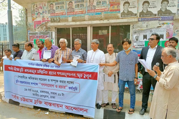 মঙ্গলবার (১৯ মার্চ) সকাল ১১টায় এ গণসংযোগ কর্মসূচিতে নেতৃত্ব দেন পার্বত্য চট্টগ্রাম চুক্তি বাস্তবায়ন আন্দোলনের দুই যুগ্ম সমন্বয়কারী মানবাধিকার কর্মী জাকির হোসেন ও ঢাকা বিশ্ববিদ্যালয়ের অধ্যাপক ড. খায়রুল ইসলাম চৌধুরী।