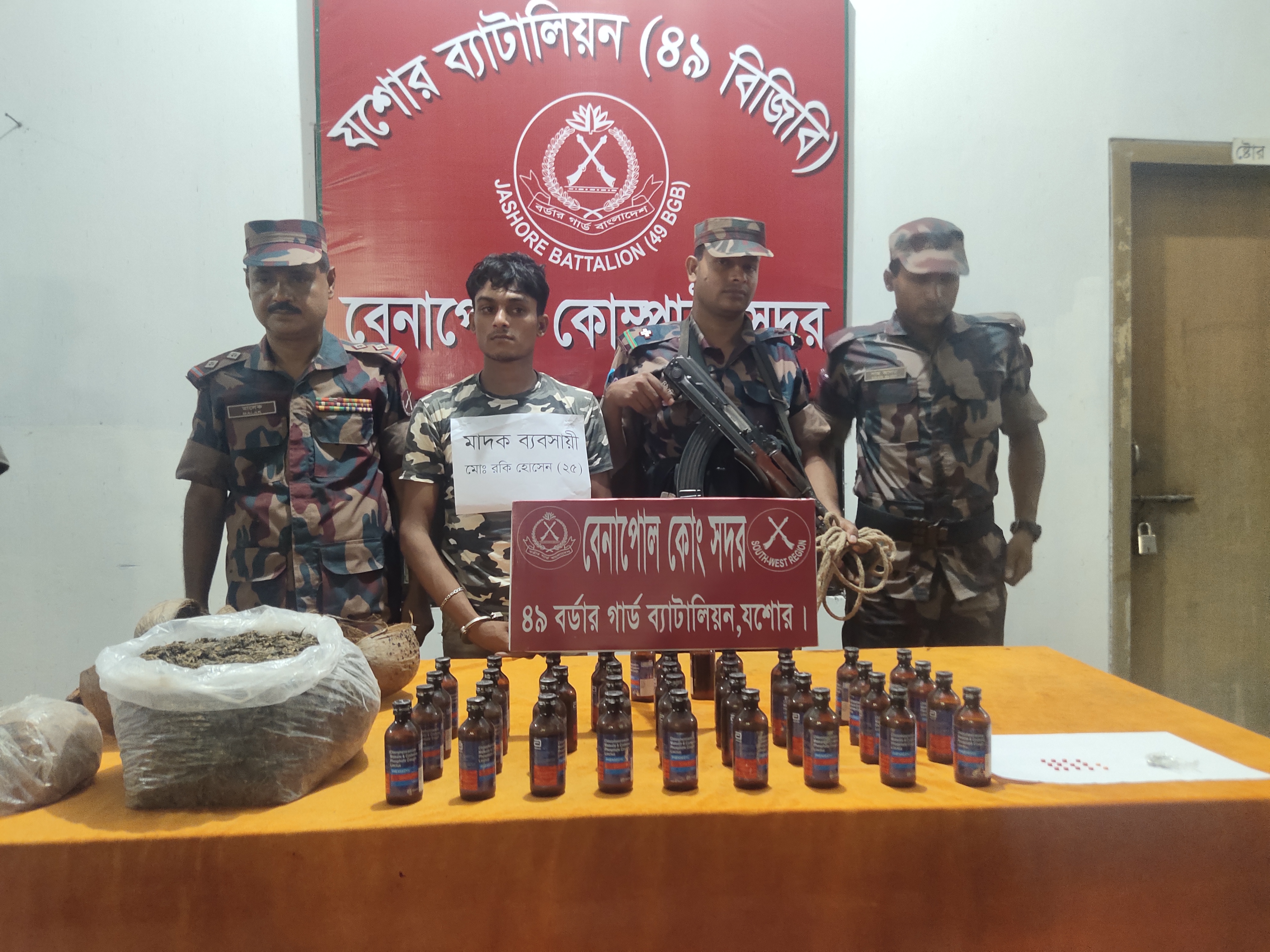 যশোরের বেনাপোল সীমান্ত থেকে ভারতীয় ৩ কেজি ৯শ গ্রাম গাঁজা, ৪১ বোতল ফেনসিডিল ও ১৪ পিস ইয়াবাসহ রকি (২২) নামে এক মাদক পাচারকারীকে আটক করেছে বর্ডার গার্ড বাংলাদেশ (বিজিবি) সদস্যরা।