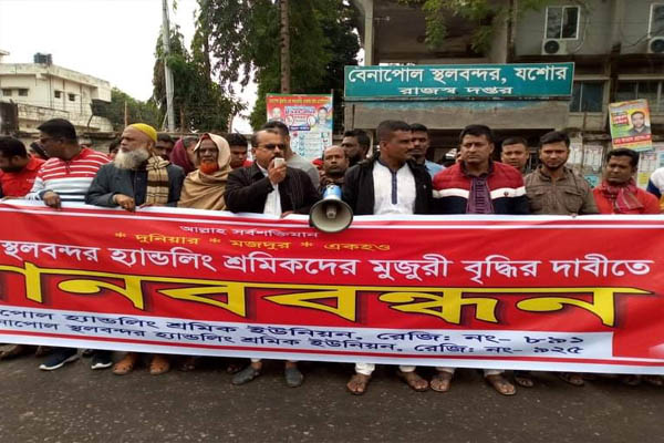 বেনাপোল স্থলবন্দরে হ্যান্ডিলিং শ্রমিকদের মজুরী বৃদ্ধির দাবীতে মানববন্ধন কর্মসূচি পালন করেছে শ্রমিকরা।