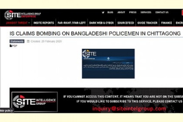 চট্টগ্রাম নগরীতে ট্রাফিক পুলিশের একটি বক্সে বিস্ফোরণের ঘটনার দায় স্বীকার করেছে জঙ্গি সংগঠন ইসলামিক স্টেট (আইএস)। যুক্তরাষ্ট্রভিত্তিক জঙ্গি নজরদারি সংস্থা 'সাইট ইন্টেলিজেন্স গ্রুপ' এমনটাই জানিয়েছে।