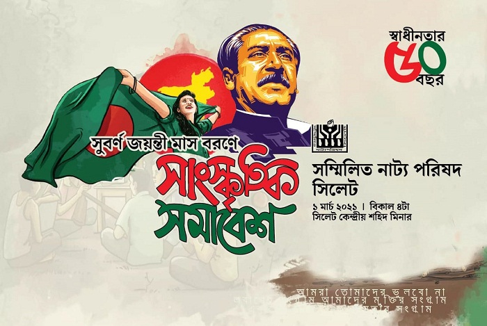 ১ মার্চ সোমবার বিকেল ৪টায় আবৃত্তি, নৃত্য ও সংগীতের মধ্য দিয়ে সিলেটের নাট্য ও সংস্কৃতি কর্মীরা সুবর্ণজয়ন্তী মাসকে বরণ করে নেবে।