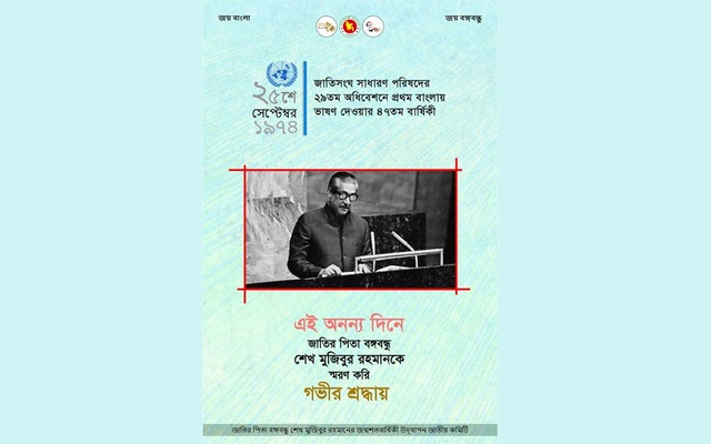 বঙ্গবন্ধু শেখ মুজিবুর রহমানের জন্মশতবার্ষিকী উদযাপন জাতীয় কমিটি জাতিসংঘের সাধারণ পরিষদে জাতির পিতা বঙ্গবন্ধু শেখ মুজিবুর রহমানের বাংলায় দেওয়া ঐতিহাসিক ভাষণের ৪৭তম বার্ষিকী স্মরণে ই-পোস্টার প্রকাশ করেছে।