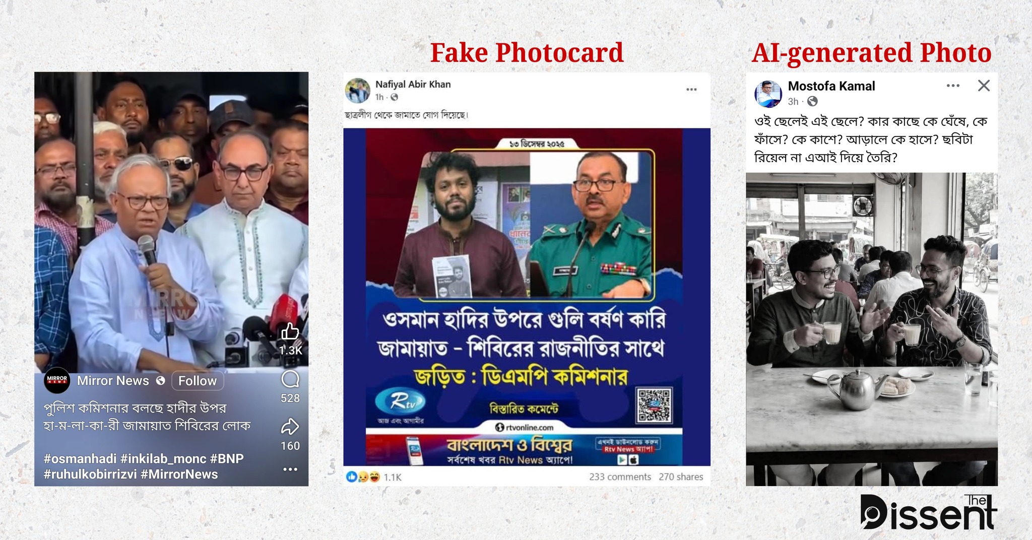 প্রথমত, গতকাল রাত থেকে ফেসবুকে আরটিভির লোগো ব্যবহার করে একটি ভুয়া ফটোকার্ড ভাইরাল হয় যেখানে শিরোনাম ছিল, “ওসমান হাদির উপরে গুলিবর্ষণকারী জামায়াত-শিবিরের রাজনীতির সাথে জড়িত : ডিএমপি কমিশনার”।