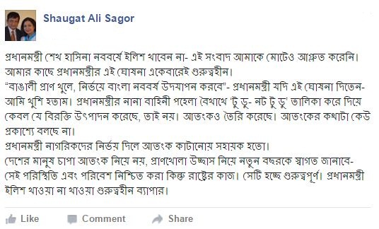 দেশের মানুষ চাপা আতংক নিয়ে নয়, প্রাণখোলা উচ্ছ্বাস নিয়ে নতুন বছরকে স্বাগত জানাবে- সেই পরিস্থিতি এবং পরিবেশ নিশ্চিত করা কিন্তু রাষ্ট্রের কাজ। সেটি হচ্ছে গুরুত্বপূর্ণ। প্রধানমন্ত্রী ইলিশ খাওয়া না খাওয়া গুরুত্বহীন ব্যাপার।