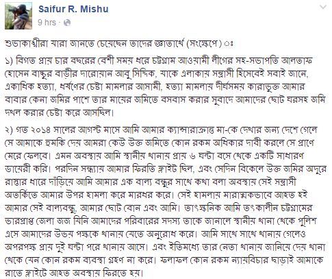 ১) বিগত প্রায় চার বছরের বেশী সময় ধরে চট্টগ্রাম আওয়ামী লীগের সহ-সভাপতি আলতাফ হোসেন বাচ্চুর বাড়ীর দারোয়ান আবু সিদ্দিক, যাকে এলাকায় সন্ত্রাসী হিসেবেই সবাই জানে, একাধিক হত্যা, ধর্ষণের চেষ্টা মামলার আসামী, হত্যা মামলায় দীর্ঘসময় কারাভুক্ত আমার বাবার কেনা জমির পাশে তার মায়ের জমিতে বসবাস করার সুবাদে আমাদের ছোট ঘরসহ জমি দখল করার চেষ্টা করে আসছিল।