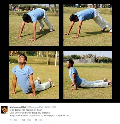 এবার বছরের শেষ দিনে ঝড়ের মুখে পড়লেন কাইফ। টুইটারে সূর্য নমস্কার করার চারটি ছবি পোস্ট করেছেন তিনি। নিজের ফিটনেস মন্ত্র ভক্তদের মধ্যে ছড়িয়ে দেওয়ার জন্যও তিনি বলেন, “সূর্য নমস্কার শরীরের জন্য একটি সম্পূর্ণ ব্যায়াম। এর জন্য কোনও রকমের ইকুইপমেন্টের প্রয়োজন হয় না।”