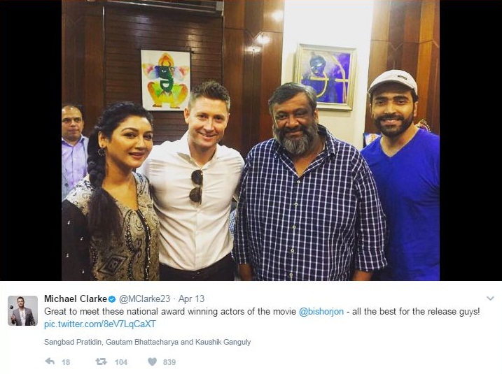 অস্ট্রেলিয়ার সাবেক অধিনায়ক মাইকেল ক্লার্ক টুইটারে দুই বাংলার জনপ্রিয় অভিনেত্রী জয়া আহসানের সিনেমার শুভকামনা জানিয়েছেন। নিজে জয়ার ছবির প্রিমিয়ার শোতে উপস্থিত ছিলেন তিনি, আর এরপর টুইটারে এক ছবি পোস্ট করে জানান শুভকামনা।