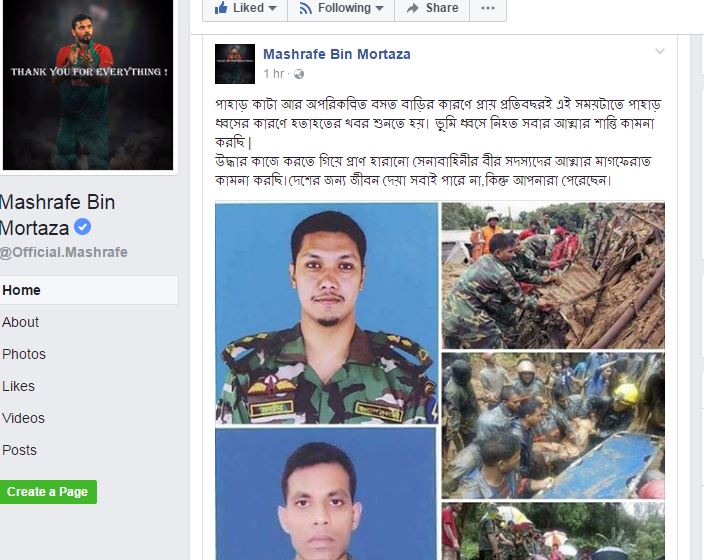 মাশরাফি আরও লিখেন, 'উদ্ধার কাজ করতে গিয়ে প্রাণ হারানো সেনাবাহিনীর বীর সদস্যদের আত্মার মাগফেরাত কামনা করছি। দেশের জন্য জীবন দেয়া সবাই পারে না, কিন্তু আপনারা পেরেছেন।'