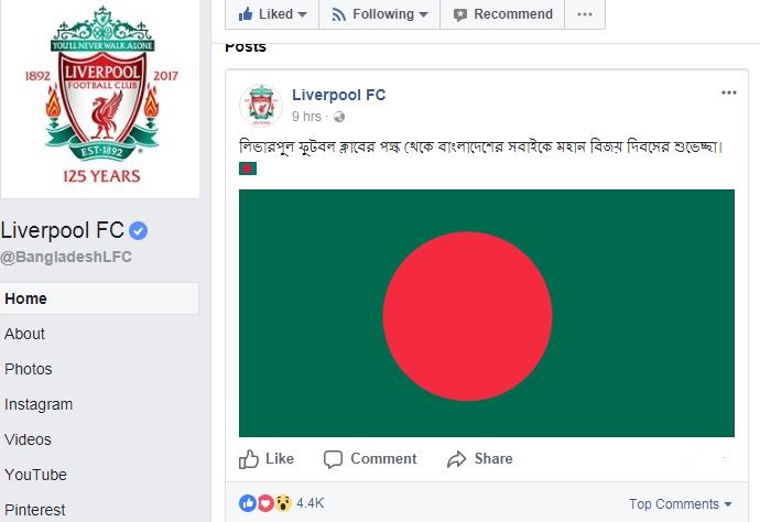 ইংলিশ ক্লাব লিভারপুল এফসি তাদের অফিসিয়াল ফেসবুক পেজ থেকে বাংলাদেশের মহান বিজয় দিবসের শুভেচ্ছা জানিয়েছে।