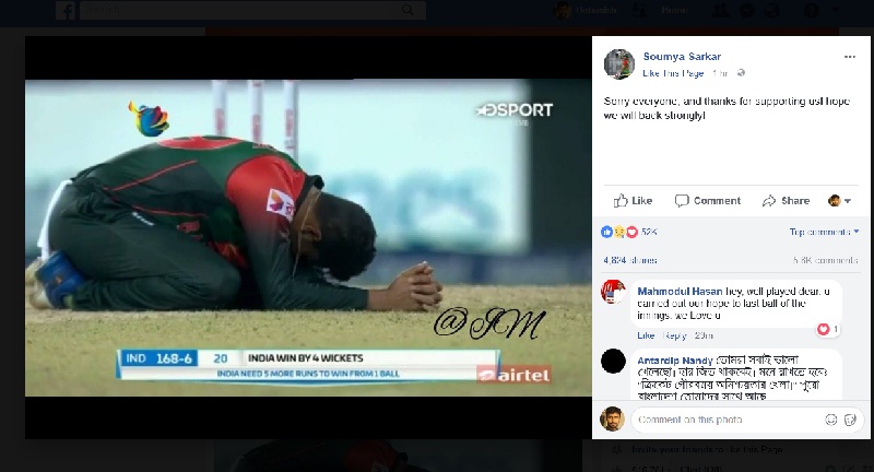 সেই দুঃস্বপ্নের মূহূর্তের এই ছবিটি খেলা শেষে নিজের ফেসবুকে পেজে আপ করে সৌম্য সরকার লিখেন- সকলের প্রতি দুঃখিত। এবং আমাদের সমর্থন করার জন্য ধন্যবাদ। আশা করি আগামীতে আরো ভালোভাবে ফিরে আসবো।