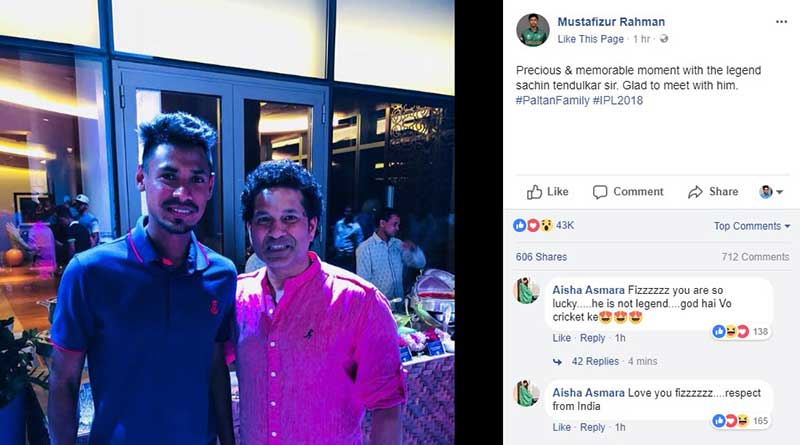 ফেসবুকে শুক্রবার রাতে নিজের পেজে ছবি পোস্ট করে জানান, ‘বহুমূল্যবান এবং স্মরণীয় মুহূর্ত কিংবদন্তি শচীন টেন্ডুলকার স্যারের সঙ্গে। তার সাথে দেখা হওয়ায় আনন্দিত।’