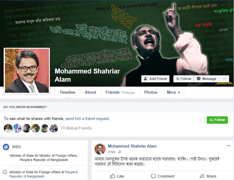 মঙ্গলবার নিজের ব্যক্তিগত আইডিতে প্রতিমন্ত্রী শাহরিয়ার আলম লিখেছেন, ‘আমার ফেসবুকের ওপর অনেক অত্যাচার হয়েছে সারা রাত। হ্যাকিং। পোস্ট উধাও। বুঝতেই পারছেন এই বিনিয়োগ কারা করেছে।’