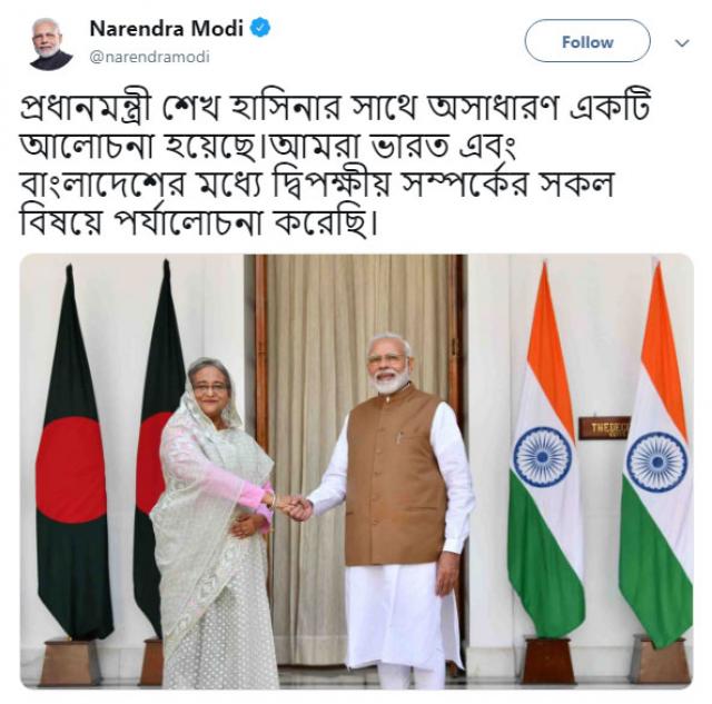 প্রধানমন্ত্রী শেখ হাসিনার সঙ্গে অসাধারণ একটি আলোচনা হয়েছে বলে মন্তব্য করেছেন ভারতের প্রধানমন্ত্রী নরেন্দ্র মোদি। শেখ হাসিনার সঙ্গে বৈঠকের পর টুইটারে বাংলা ভাষাতে টুইট করেন ভারতীয় এই প্রধানমন্ত্রী। নিজের ভেরিফায়েড টুইটার অ্যাকাউন্টে মোদি লিখেন, ‘প্রধানমন্ত্রী শেখ হাসিনার সাথে অসাধারণ একটি আলোচনা হয়েছে। আমরা ভারত এবং বাংলাদেশের মধ্যে দ্বিপক্ষীয় সম্পর্কের সকল বিষয়ে পর্যালোচনা করেছি।’